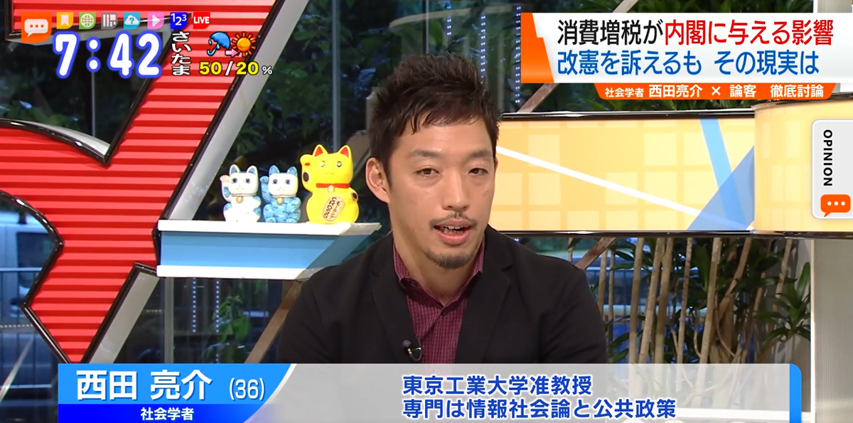 2019年10月4日Tokyo MX『モーニングCROSS』コメンテーターでした。同業の富永京子さんとご一緒しました。「日本は不思議な国で、消費増税に嫌悪感をあまり示さない。特に最近その傾向が強い。企業社会は消費税引き上げを要求してきた。(国にとって)引き上げは一番楽で、1ポイント増やせば2兆円強の税収増。企業に対する課税を増やしてもいいのでは。日本で声が大きいのは企業社会だけ。」西田亮介 #クロス— Hiroyuki KAWAKITA (@kawanky) October 4, 2019